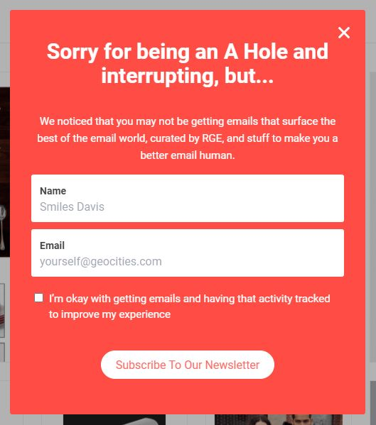 But sometimes a perky little popup begs forgiveness. Like this one from Really Good Emails: