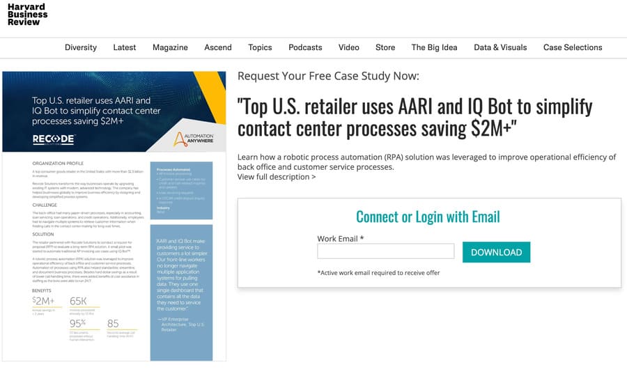 It provides strategic direction to business owners as they sample the Harvard Business Review’s valuable insight and enter the organization’s email marketing funnel.