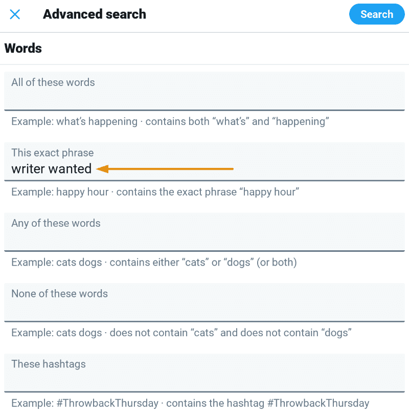 In the example below, I searched for tweets that included the phrase “writer wanted”: