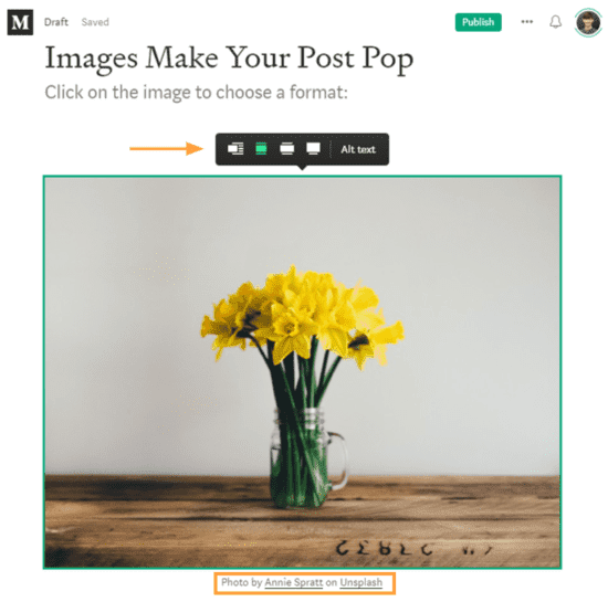 Medium allows you to browse an extensive library of free Unsplash images right there on the page (attribution is automatically placed in a caption below).
