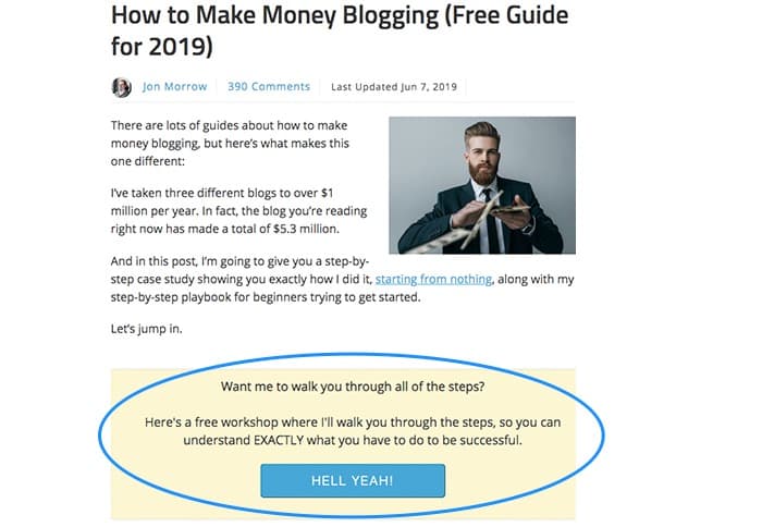 Here at Smart Blogger, we use a content upgrade in our popular post about how to make money blogging. It’s a free workshop that gives more actionable advice to help new bloggers be successful.